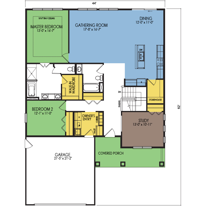 A part of our dream series, the tamarack floor plan features 3 bedrooms and 1.5 bathrooms with a foot print of 44x30 feet and 1342 total square feet of living space.