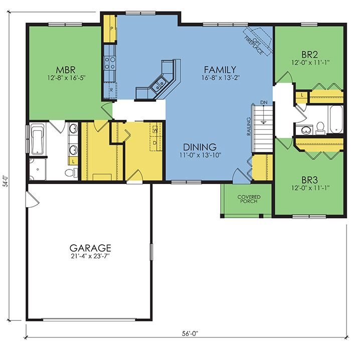 A part of our Wausau Originals, the Comstock floor plan features 3 bedrooms and 2 bathrooms with a foot print of 56x54 feet and 1674 total square feet of living space. Floor Plan #WO234