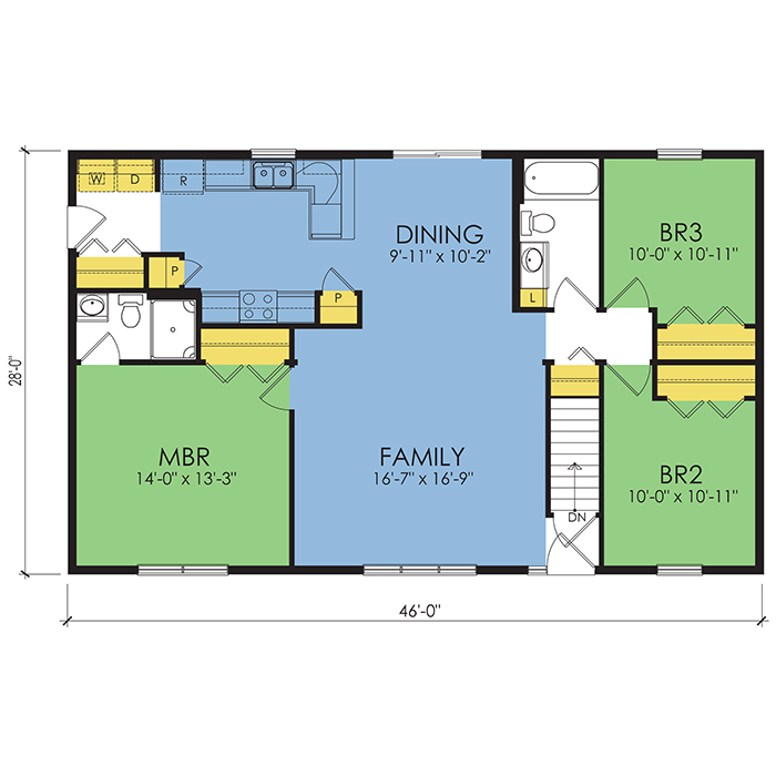 A part of our Wausau Originals, the Winfield floor plan features 3 bedrooms and 2 bathrooms with a foot print of 46x28 feet and 1288 total square feet of living space. Floor Plan #WO114