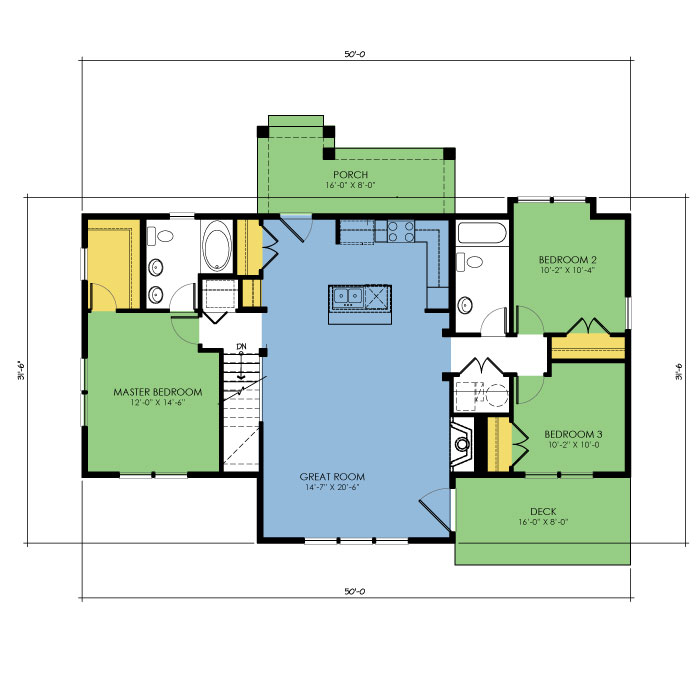 A part of our Vacation Series, the Winifred floor plan features 3 bedrooms and 2 bathrooms with a foot print of 50x32 feet and 1320 total square feet of living space. Floor Plan #VL104