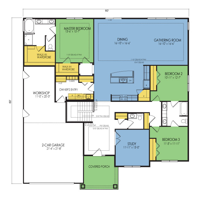 A part of our Designer Series, the Royal Oaks floor plan features 3 bedrooms and 2.5 bathrooms with a foot print of 60x60 feet and 2559 total square feet of living space. Floor Plan #DN136
